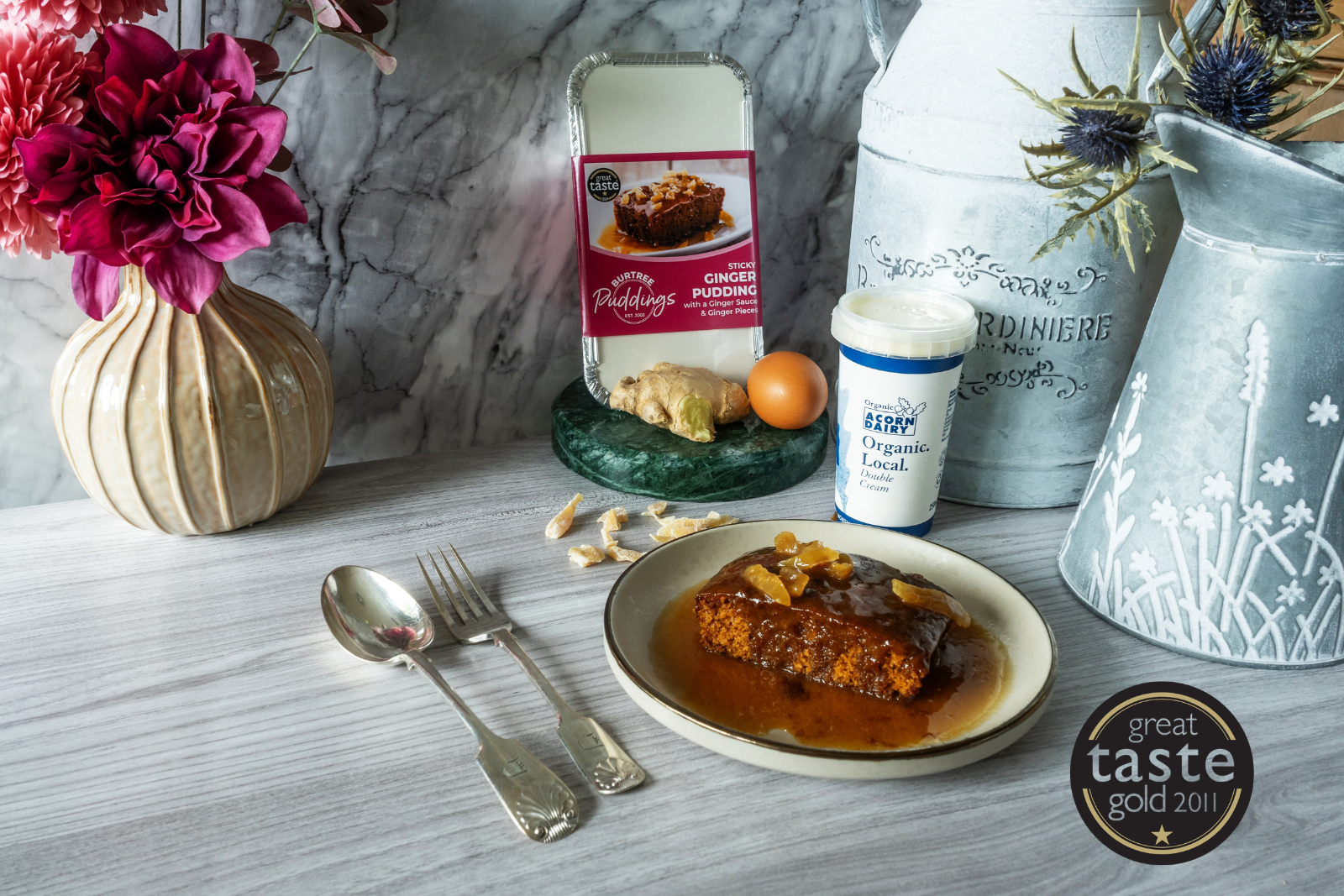 Ginger Pudding made with real Ginger Burtree Puddings sponge topped with Ginger pieces and topped with a delicious Ginger sauce.