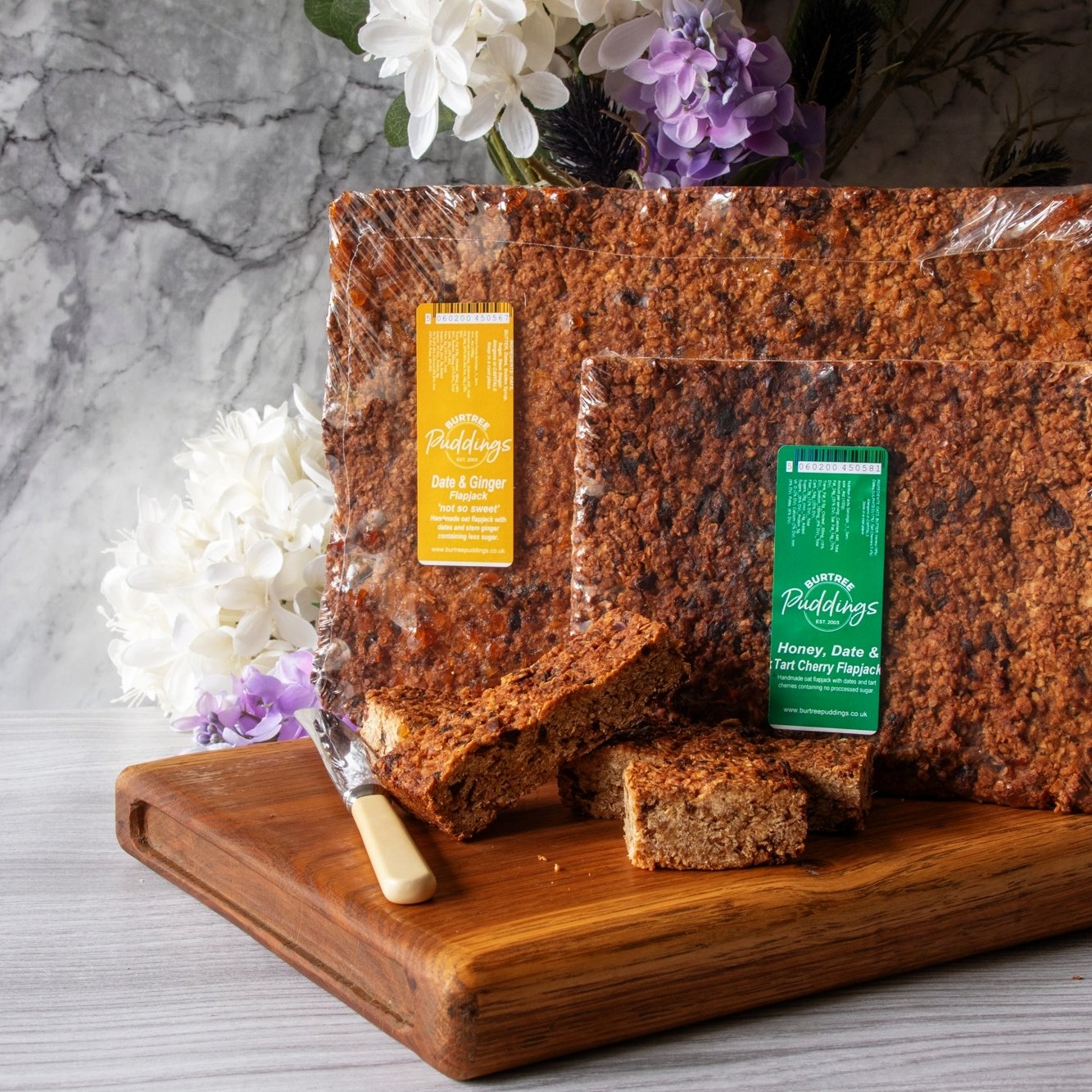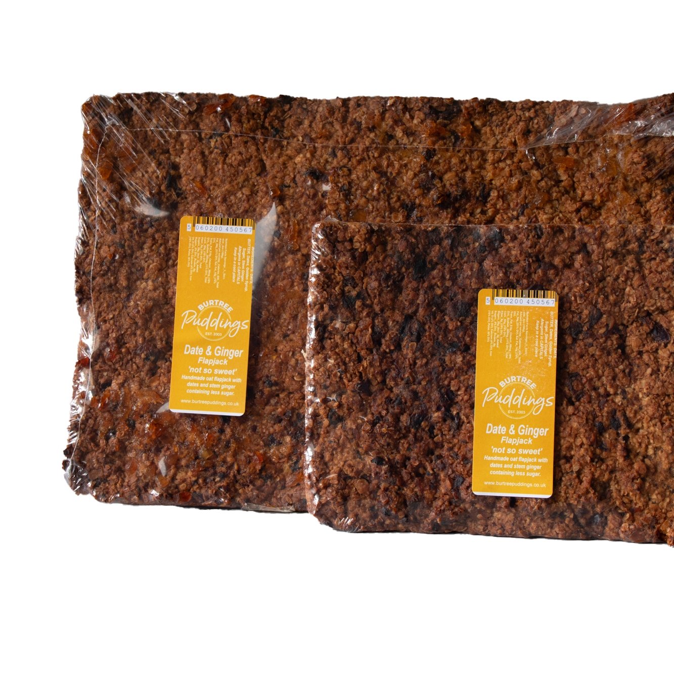 Not as sweet as the rich flapjack with a drier firmer texture with sticky dates and crushed stem ginger.